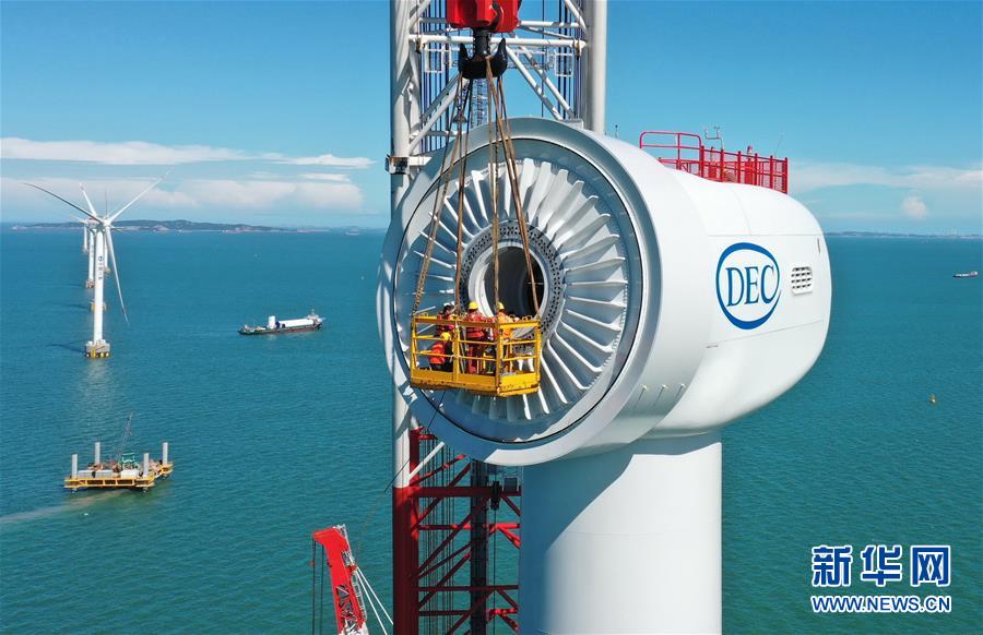 施工人員在福建福清興化灣二期海上風電場10兆瓦海上風電機組安裝現(xiàn)場忙碌(6月12日攝,無人機照片)。記者7月13日從三峽集團了解到,國內(nèi)首臺10兆瓦海上風電機組日前在三峽集團福建福清興化灣二期海上風電場成功并網(wǎng)發(fā)電,這是目前我國自主研發(fā)的單機容量亞太地區(qū)最大、全球第二大的海上風電機組,刷新了我國海上風電單機容量新紀錄。新華社記者 林善傳 攝