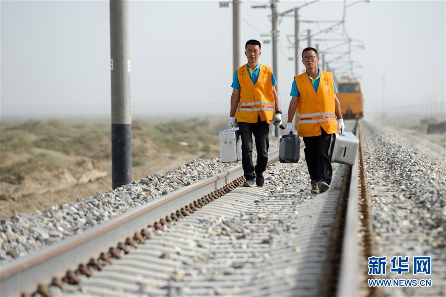 鋼軌打磨機(jī)組的技術(shù)員拎著重達(dá)20公斤的設(shè)備前往下一個(gè)檢測(cè)點(diǎn)(7月14日攝)。新華社記者 丁磊 攝