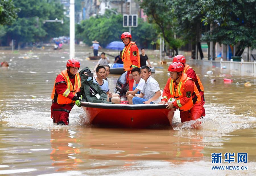7月11日,廣西融水消防救援大隊的救援人員在轉移被困群眾。受連日強降雨影響,廣西柳州市融水苗族自治縣融江水位暴漲,導致縣城出現嚴重洪澇災害。新華社記者黃孝邦攝
