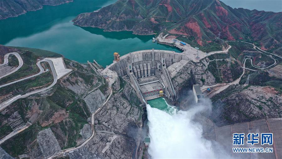 7月9日,位于青海省尖扎縣和化隆縣交界處的李家峽水電站提門泄水(無(wú)人機(jī)照片)。新華社記者吳剛攝