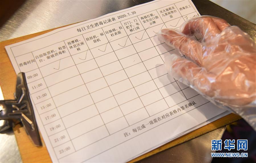 7月20日,濟南新世紀電影城陽光100店的員工在展示消殺記錄。當(dāng)日,山東濟南市部分電影院在嚴格防控疫情的基礎(chǔ)上陸續(xù)恢復(fù)開放。新華社記者王凱攝