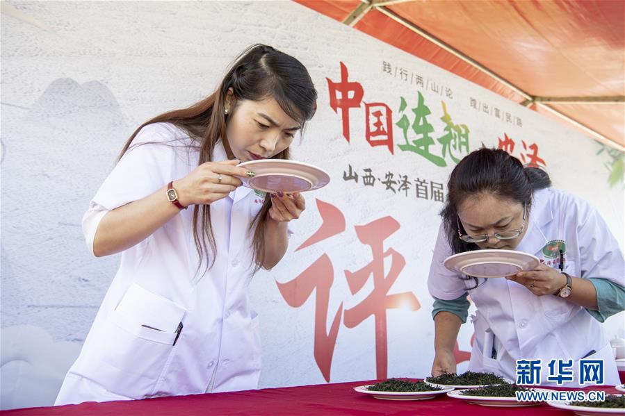 7月20日,在位于安澤縣飛嶺村的斗茶文化主題活動現(xiàn)場,比賽評委對制成的茶葉進行評審。新華社記者楊晨光攝
