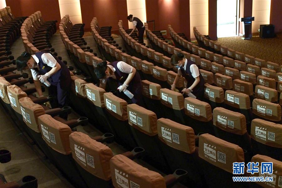 2020年7月19日,上海影城員工在放映廳里為座位消毒。當日,上海部分電影院為恢復開放營業(yè)進行最后階段準備。新華社記者任瓏攝
