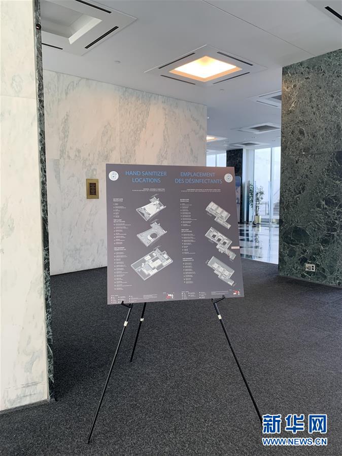 7月20日,在位于紐約的聯(lián)合國總部,秘書處大樓入口附近豎立著一塊標(biāo)明消毒液擺放點的指示牌。受新冠疫情影響而實行遠(yuǎn)程辦公4個多月的紐約聯(lián)合國總部20日進(jìn)入重啟第一階段。按規(guī)定,該階段每天進(jìn)入總部大樓人數(shù)不能超過400人。新華社記者王建剛攝