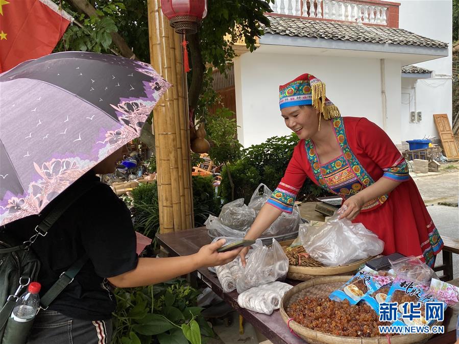 廣西恭城瑤族自治縣蓮花鎮(zhèn)紅巖村村民楊燕紅在家門口向客人推銷本地特產(chǎn)(7月16日攝)。新華社記者林凡詩攝