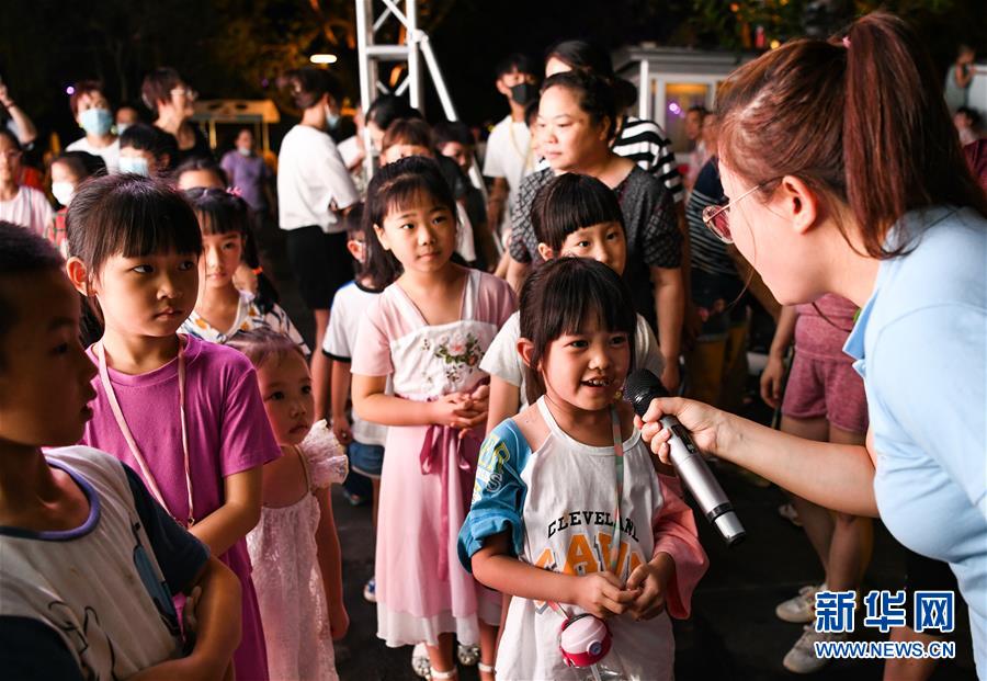 7月23日晚,在成都市成華區(qū)望平街濱河路的天府文創(chuàng)大集市上,參加讀書(shū)活動(dòng)的小朋友在介紹自己閱讀過(guò)的童話(huà)故事。新華社記者 王曦 攝