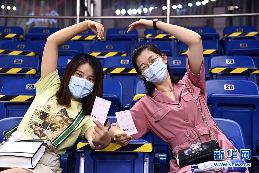7月26日,在青島國(guó)信體育館,兩位現(xiàn)場(chǎng)觀看比賽的觀眾展示著自己的紙質(zhì)球票。當(dāng)日,在山東青島舉行的2019-2020賽季中國(guó)男子籃球職業(yè)聯(lián)賽(CBA)復(fù)賽第二階段(嶗山賽區(qū))比賽中,醫(yī)護(hù)人員、教師、公安戰(zhàn)線人士通過(guò)官方購(gòu)票平臺(tái),完成包括核酸檢測(cè)在內(nèi)的相關(guān)流程后進(jìn)場(chǎng)觀看了上海久事隊(duì)迎戰(zhàn)山東西王隊(duì)的比賽。觀賽期間,觀賽者須全程佩戴口罩,對(duì)號(hào)入座,嚴(yán)格保持間隔一米就座。退場(chǎng)時(shí),觀眾須按照自后向前、先兩邊后中間的順序,保持“一米線”社交距離有序退場(chǎng)。新華社記者 郭緒 雷攝