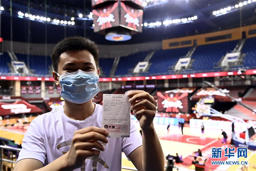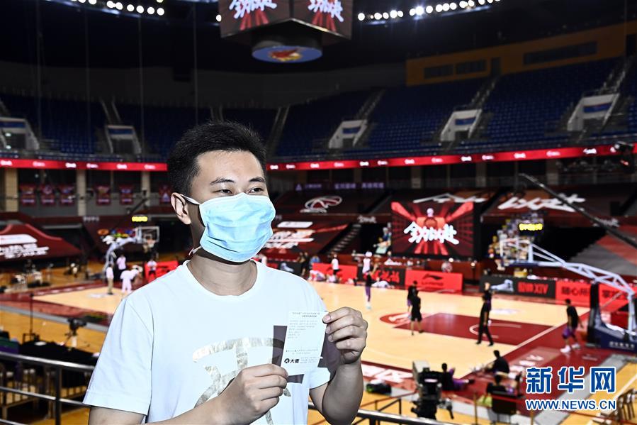 7月26日,在青島國(guó)信體育館,蘇柯帆展示著自己的紙質(zhì)球票。他成為CBA聯(lián)賽復(fù)賽允許觀眾現(xiàn)場(chǎng)觀賽后,首位進(jìn)場(chǎng)的觀眾。當(dāng)日,在山東青島舉行的2019-2020賽季中國(guó)男子籃球職業(yè)聯(lián)賽(CBA)復(fù)賽第二階段(嶗山賽區(qū))比賽中,醫(yī)護(hù)人員、教師、公安戰(zhàn)線人士通過(guò)官方購(gòu)票平臺(tái),完成包括核酸檢測(cè)在內(nèi)的相關(guān)流程后進(jìn)場(chǎng)觀看了上海久事隊(duì)迎戰(zhàn)山東西王隊(duì)的比賽。觀賽期間,觀賽者須全程佩戴口罩,對(duì)號(hào)入座,嚴(yán)格保持間隔一米就座。退場(chǎng)時(shí),觀眾須按照自后向前、先兩邊后中間的順序,保持“一米線”社交距離有序退場(chǎng)。新華社記者 郭緒雷 攝