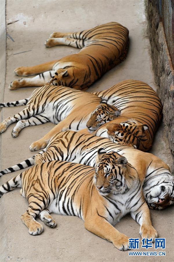 在橫道河子東北虎林園,東北虎在休息(7月27日攝)。時值盛夏,位于黑龍江省海林市的橫道河子東北虎林園的東北虎活動量減少,以不同方式消夏納涼。新華社記者王建威攝