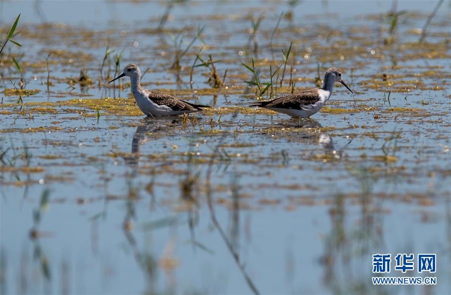 7月28日,兩只長腳鷸在桃力廟—阿拉善灣海子覓食。鄂爾多斯?jié)竦匚挥趲觳箭R沙漠、毛烏素沙地接壤地帶,2002年被列入國際重要濕地名錄。從2006年開始,由于濕地湖面萎縮、湖心島消失,在此筑巢繁殖的世界瀕危物種遺鷗幾近消失。近年來,當地采取多種治理措施,濕地生態(tài)環(huán)境逐步好轉。2019年起,濕地內的桃力廟—阿拉善灣海子迎來遺鷗大規(guī)模“回歸”。如今,40多種鳥類在此棲息,鄂爾多斯?jié)竦刂匦鲁蔀轼B類的樂園。新華社記者連振攝