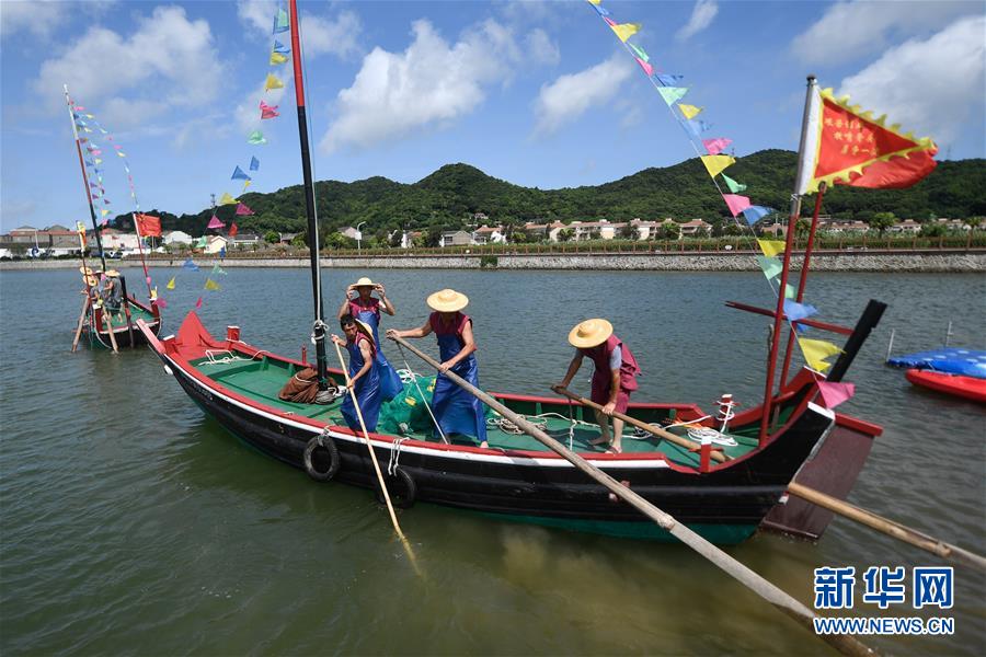 8月1日,螞蟻島居民在避風塘漁民勞作現(xiàn)場體驗區(qū)為游客表演木帆船捕魚。新華社記者黃宗治攝