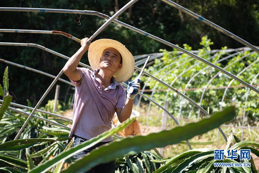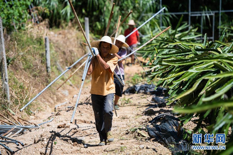 受近期多輪強(qiáng)降水引發(fā)的山洪影響,位于湖南省保靖縣碗米坡鎮(zhèn)首八峒村的易甸園水果有限公司種植基地大棚內(nèi)上百株火龍果枝條受損,當(dāng)?shù)卮迕裾ゾo搶修大棚,降低災(zāi)害損失。新華社記者李鑫攝
