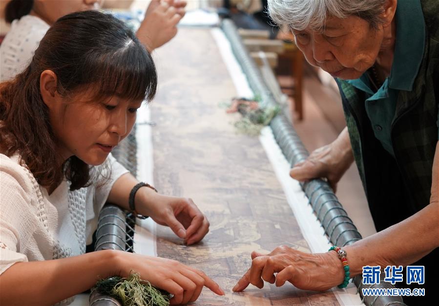 在開封市素花宋繡工藝有限公司的展示館里,王素花(右)在指導(dǎo)徒弟刺繡(7月30日攝)。新華社記者李嘉南攝