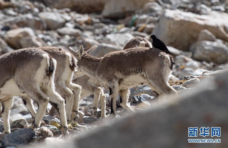在珠峰大本營附近,一只黃嘴山鴉停在巖羊背上(5月8日攝)。新華社記者晉美多吉攝
