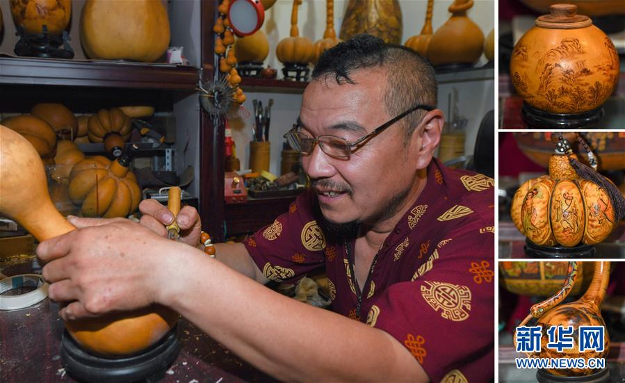 8月5日,侯景偉挑選適合創(chuàng)作的葫蘆。今年55歲的吉林四平人侯景偉自幼與家人學(xué)習(xí)雕刻、烙畫(huà)藝術(shù)。經(jīng)過(guò)多年潛心研究,他將浮雕和烙畫(huà)工藝相結(jié)合,通過(guò)拋光、起稿、雕刻、烙燙、套色等十余道工藝,制作展現(xiàn)傳統(tǒng)文化、民俗故事的葫蘆工藝品。2020年,侯景偉被評(píng)為四平市非物質(zhì)文化遺產(chǎn)項(xiàng)目侯氏葫蘆雕刻烙畫(huà)代表性傳承人。他說(shuō):“希望有更多人加入到非遺傳承隊(duì)伍中,讓小葫蘆‘講’出更多民俗故事?!毙氯A社記者張楠攝