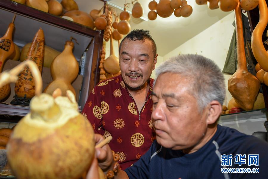 8月5日,侯景偉(左)向徒弟金志勇傳授技藝。今年55歲的吉林四平人侯景偉自幼與家人學(xué)習(xí)雕刻、烙畫(huà)藝術(shù)。經(jīng)過(guò)多年潛心研究,他將浮雕和烙畫(huà)工藝相結(jié)合,通過(guò)拋光、起稿、雕刻、烙燙、套色等十余道工藝,制作展現(xiàn)傳統(tǒng)文化、民俗故事的葫蘆工藝品。2020年,侯景偉被評(píng)為四平市非物質(zhì)文化遺產(chǎn)項(xiàng)目侯氏葫蘆雕刻烙畫(huà)代表性傳承人。他說(shuō):“希望有更多人加入到非遺傳承隊(duì)伍中,讓小葫蘆‘講’出更多民俗故事。”新華社記者張楠攝