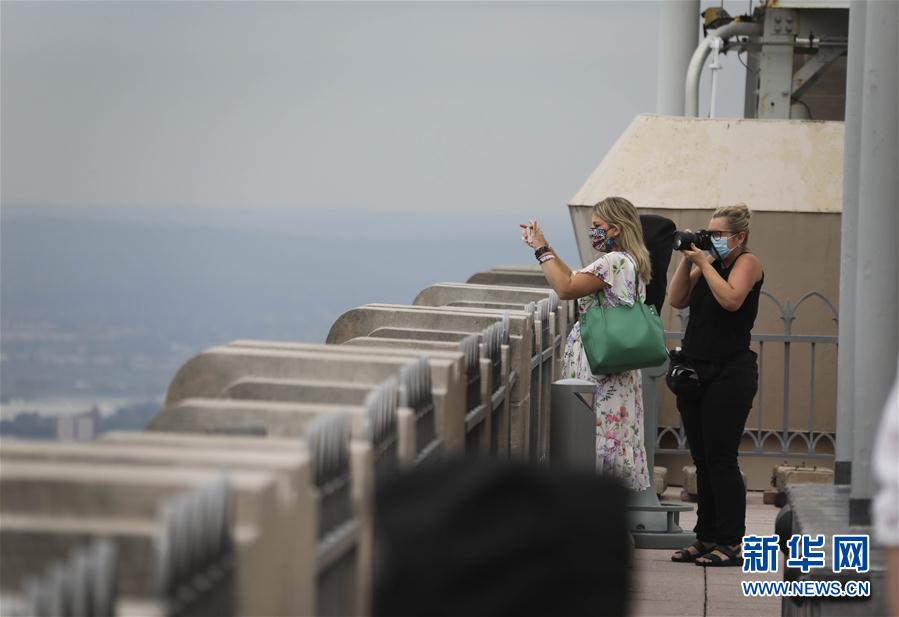 8月6日,在美國紐約,人們在洛克菲勒中心觀景臺上觀看城市景觀。當日,3月份暫時關閉的洛克菲勒中心觀景臺恢復對公眾開放。每天13時至21時,人們可戴口罩前往參觀。新華社記者王迎攝