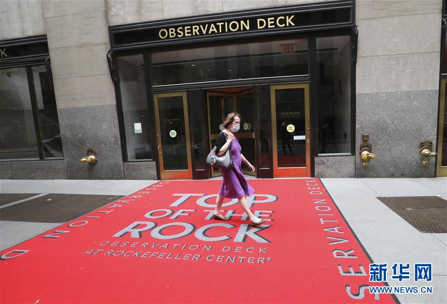 8月6日,在美國紐約,一名女子從洛克菲勒中心觀景臺的入口走過。當日,3月份暫時關閉的洛克菲勒中心觀景臺恢復對公眾開放。每天13時至21時,人們可戴口罩前往參觀。新華社記者王迎攝