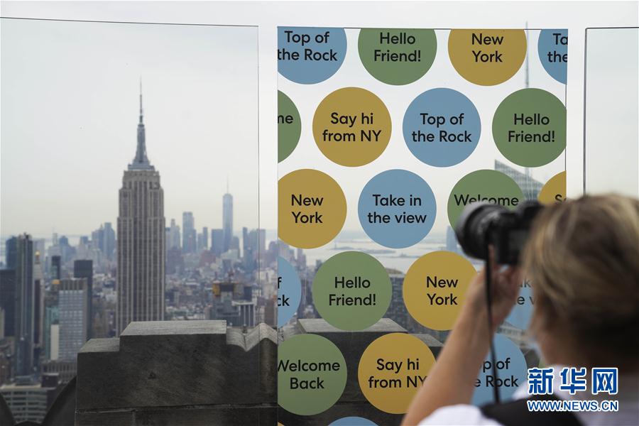 8月6日,在美國紐約,一名攝影師在洛克菲勒中心觀景臺上參觀。當日,3月份暫時關閉的洛克菲勒中心觀景臺恢復對公眾開放。每天13時至21時,人們可戴口罩前往參觀。新華社記者王迎攝