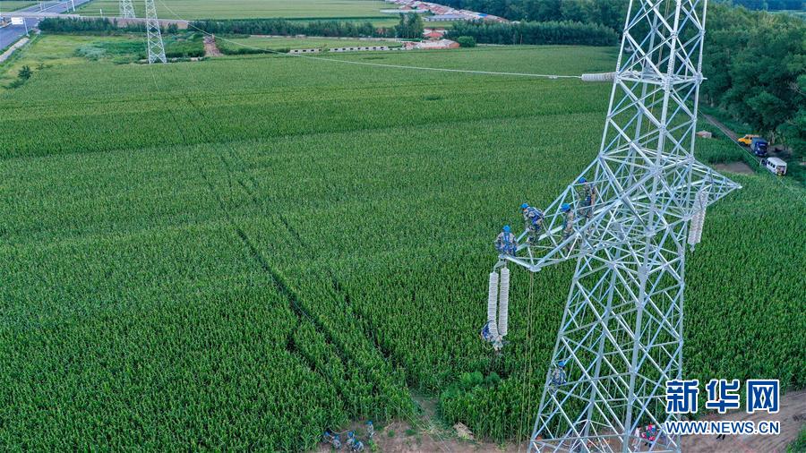 8月6日,幾名送電工在吉林省長(zhǎng)春市城郊的一處輸電鐵塔上施工作業(yè)(無人機(jī)照片)。吉林省長(zhǎng)春市連續(xù)多日出現(xiàn)高溫天氣,國(guó)網(wǎng)長(zhǎng)春供電公司輸電運(yùn)檢中心的送電工們每天清晨開始作業(yè),不畏烈日“烤”驗(yàn),堅(jiān)守工作崗位,確保工程按計(jì)劃完成。新華社記者張楠攝