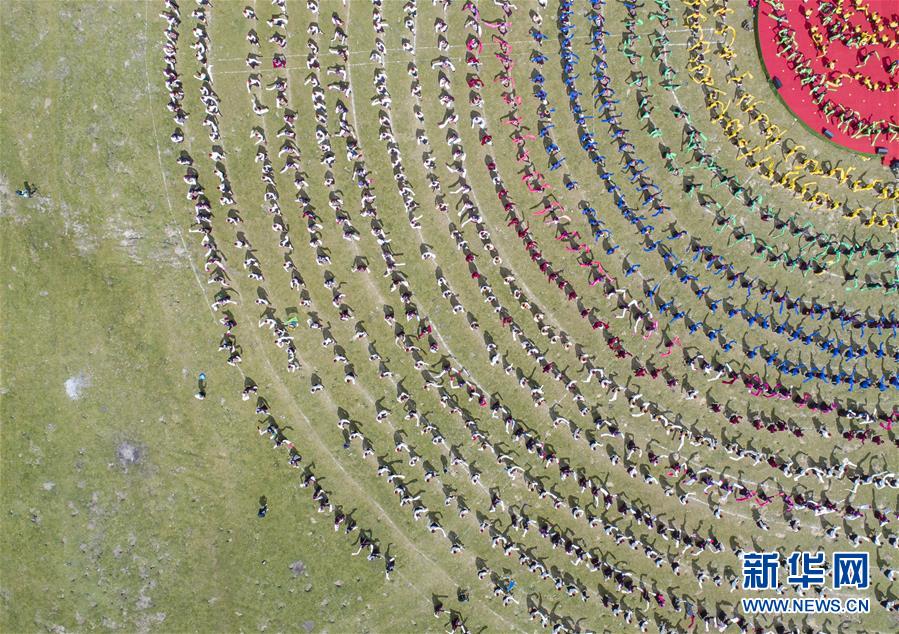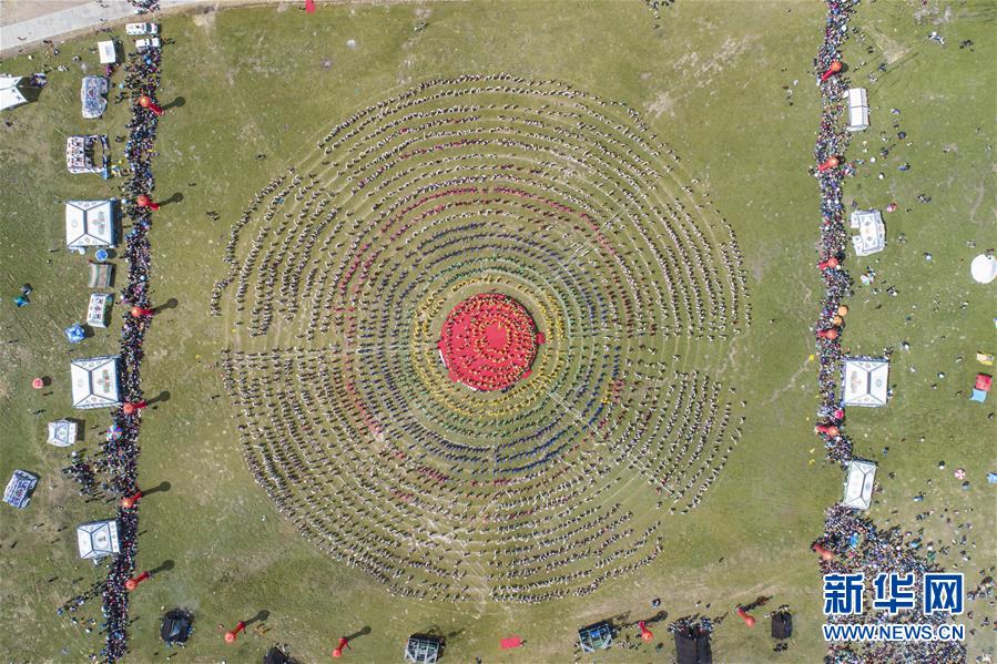 西藏首屆弦子舞展演現(xiàn)場(8月7日攝,無人機(jī)照片)。當(dāng)日,西藏首屆弦子舞展演在昌都市芒康縣舉行。眾多演員同臺獻(xiàn)藝,表演國家級非物質(zhì)文化遺產(chǎn)弦子舞,吸引西藏各地的群眾前來觀看。新華社記者孫非攝
