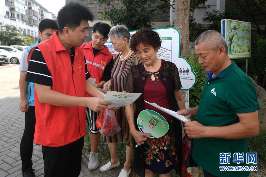 8月9日,湖州市吳興區(qū)八里店鎮(zhèn)志愿者(左)在百合苑小區(qū)向居民介紹生活垃圾定點投放的注意事項。近年來,浙江省通過創(chuàng)新宣傳教育,多措并舉促進(jìn)垃圾分類投放、收運及處置的良性循環(huán),引領(lǐng)垃圾分類成為城鄉(xiāng)居民的生活新風(fēng)尚。新華社記者黃宗治攝。