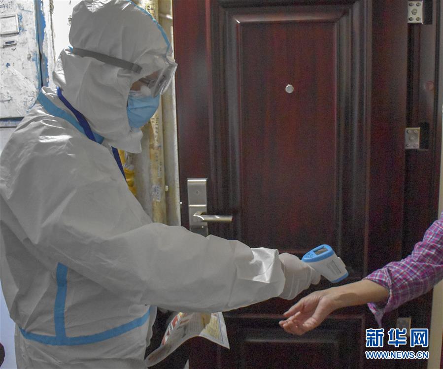 8月12日,烏魯木齊市天山區(qū)山西巷社區(qū)工作人員王志鷹(左)上門為居家居民測(cè)量體溫。新華社記者 高晗