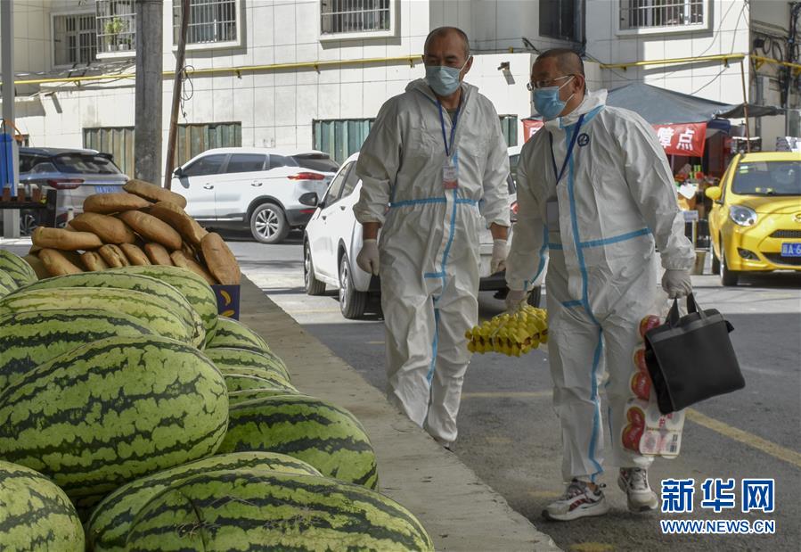 8月12日,烏魯木齊市天山區(qū)山西巷社區(qū)工作人員王志鷹(右)在社區(qū)物資保障點(diǎn)前詢問(wèn)水果銷售情況。新華社記者 高晗攝