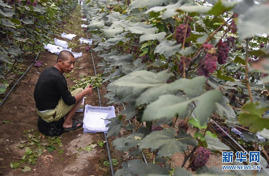 8月13日,在吉林省磐石市煙筒山鎮(zhèn)民主村,村民在葡萄大棚內(nèi)采摘葡萄。時下,吉林省磐石市煙筒山鎮(zhèn)棚膜葡萄園區(qū)內(nèi)的大棚葡萄進入采摘季,農(nóng)民喜獲豐收。近年來,當?shù)赝ㄟ^“共創(chuàng)”與“扶持”相結合的模式大力發(fā)展特色農(nóng)業(yè),建設葡萄種植大棚300余棟,以此帶動村集體經(jīng)濟發(fā)展,助力農(nóng)民增收致富。新華社記者許暢攝