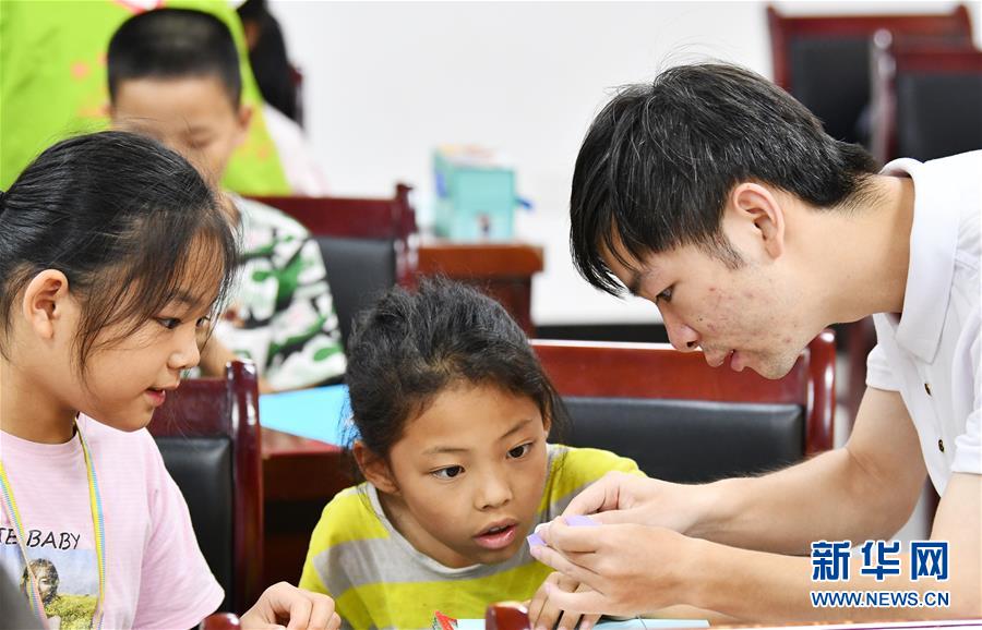 8月13日,在貴州省思南縣雙塘街道麗景社區(qū)易地扶貧搬遷安置點,志愿者在指導孩子們學習剪紙。新華社記者楊文斌攝