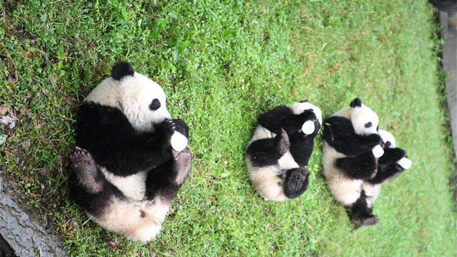 4只大熊貓?jiān)谥貞c動(dòng)物園熊貓館運(yùn)動(dòng)場(chǎng)內(nèi)玩耍嬉戲,享用市民游客為它們親手制作的“生日蛋糕”。
