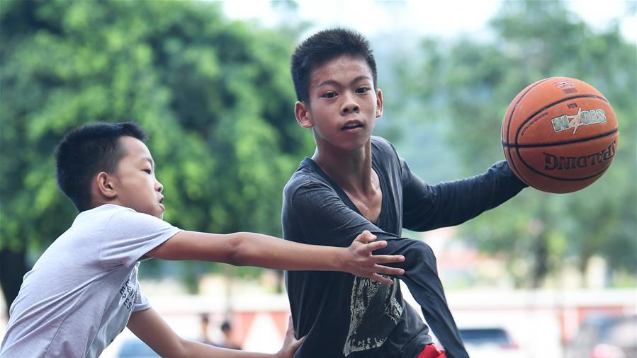 圖為6月4日,張家城在體育課上練習(xí)上籃(無人機照片)。