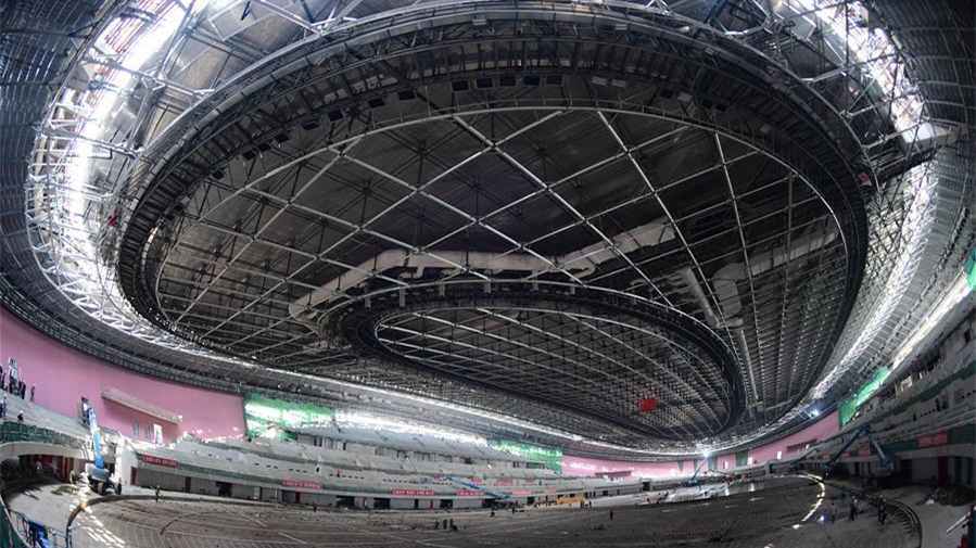 7月22日,工人在國家速滑館內(nèi)施工。