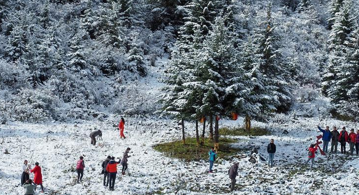 當(dāng)日,一場(chǎng)夜雪后,川藏線高爾寺山至理塘路段披上了一層銀裝。雪山、牦牛、云朵、松林,帶來(lái)了濃濃的雪域風(fēng)情。