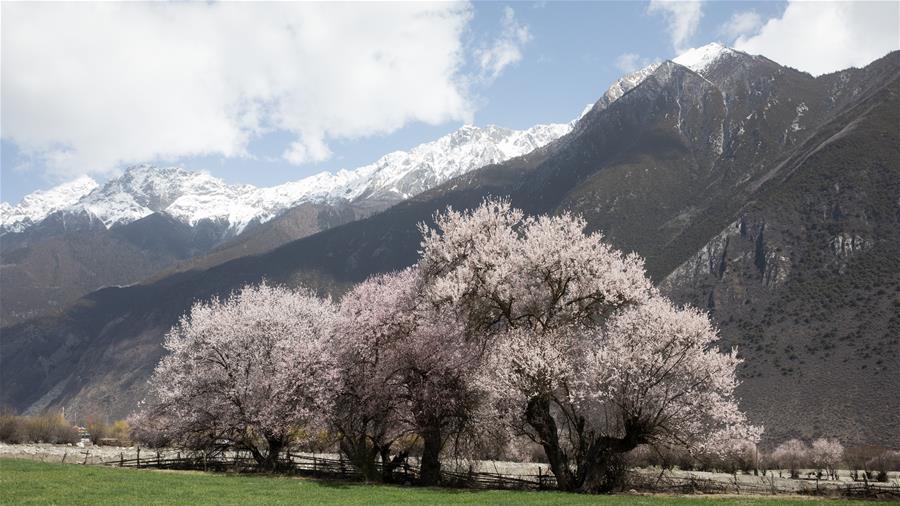 近日,西藏林芝市波密縣桃花溝里的桃花相繼綻放,與雪山相映,令人流連忘返。新華社記者 金立旺 攝 這是波密縣桃花溝桃花盛開的美景(4月2日攝)。