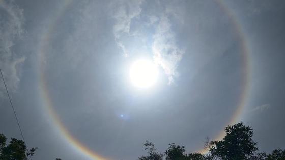 日照當(dāng)頭,太陽周圍被一個碩大的光圈包裹,形成一幅絕美景象,網(wǎng)友驚呼“美到窒息”。