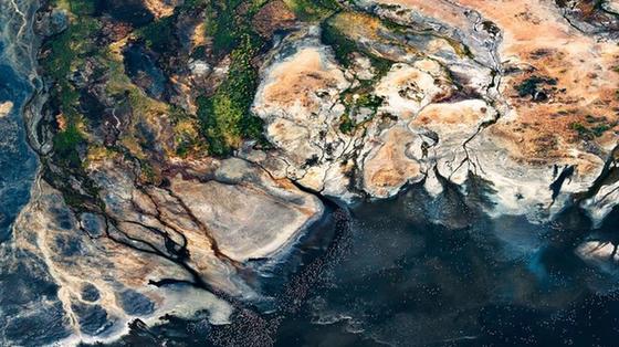 坦桑尼亞北部納特龍湖,一群火烈鳥飛過“火星地”。這個湖生長著大量紅色素藍(lán)藻,許多以此為食的各色的鳥聚集在這。