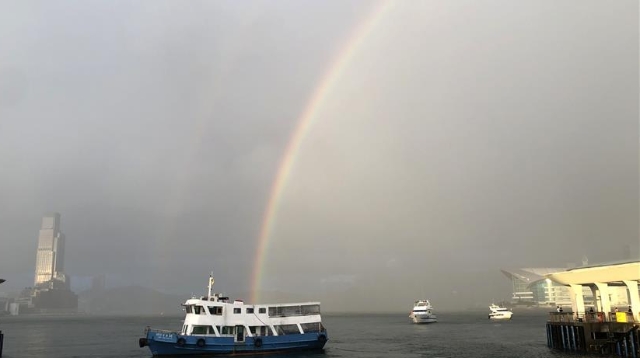 香港維多利亞港上空出現(xiàn)彩虹(6月16日攝)。 6月16日傍晚,雨后的香港維多利亞港上空出現(xiàn)彩虹,美麗景色吸引市民駐足拍照。