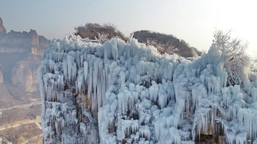 近日,河北省平山縣境內的沕沕水景區(qū)出現(xiàn)冰瀑美景,形態(tài)各異的冰柱懸掛在山麓間,吸引游客前來觀賞。
