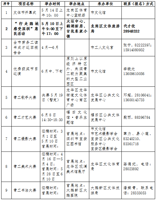 活動(dòng)期間,全市將舉辦25項(xiàng)全市性重要活動(dòng),分為6項(xiàng)活動(dòng),19項(xiàng)比賽。其中,6項(xiàng)活動(dòng)為開(kāi)幕式、“行走鵬城 感受深圳”惠民活動(dòng)、全市勞務(wù)工讀書(shū)成才巡回報(bào)告會(huì)、來(lái)深青工文體節(jié)回顧圖片展、閉幕式及優(yōu)秀獲獎(jiǎng)節(jié)目展演;19項(xiàng)比賽活動(dòng)分別是來(lái)深青工歌手大賽(全國(guó))、才藝大賽、攝影大賽(全國(guó))、美術(shù)大賽、書(shū)法大賽、知識(shí)競(jìng)賽、演講比賽、打工文學(xué)大賽(全國(guó))、羽毛球混合團(tuán)體賽、跳繩比賽、乒乓球競(jìng)賽、趣味體育比賽、拔河比賽、三人籃球賽、業(yè)余定向賽競(jìng)賽、登山比賽、棋類(lèi)挑戰(zhàn)賽、趣味沙灘排球比賽、廣場(chǎng)健身操比賽。參賽對(duì)象主要為在深工作的18至50歲非深戶籍人士(不包括在各類(lèi)文化演藝公司、培訓(xùn)機(jī)構(gòu)中從事文藝表演、培訓(xùn)的專(zhuān)業(yè)人員)。