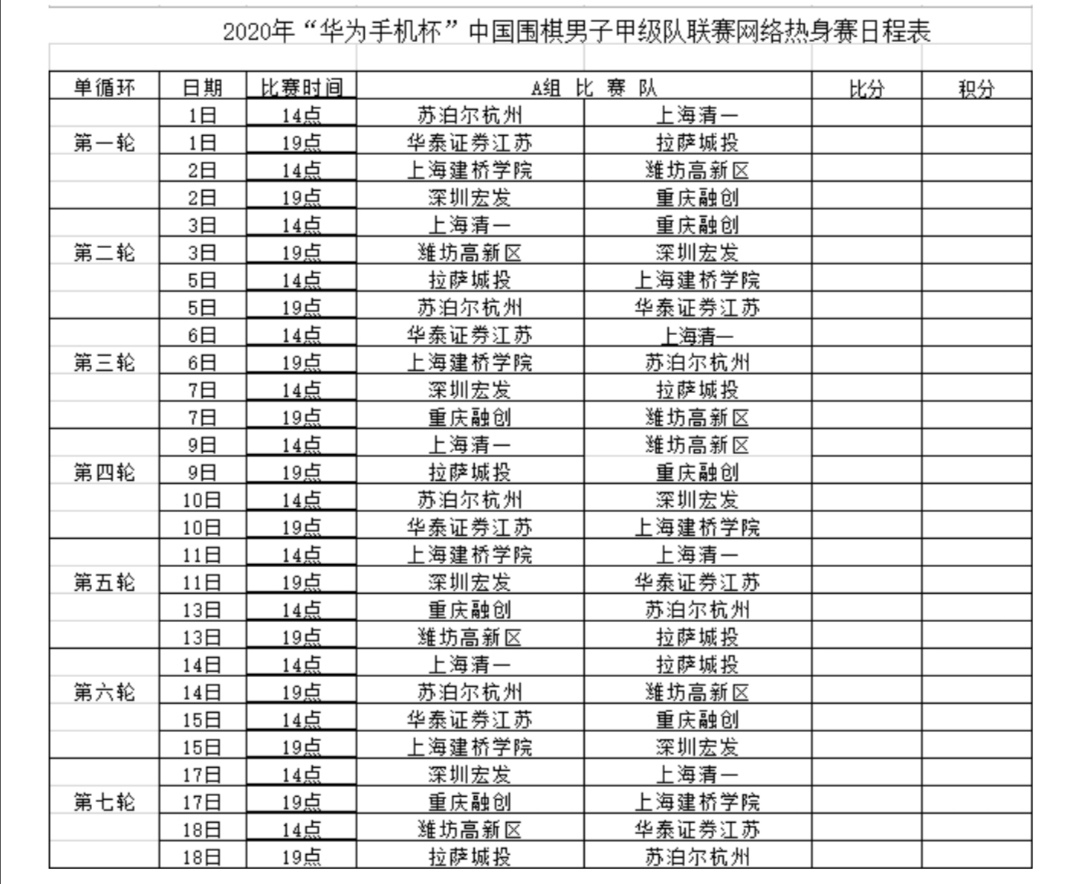 附:2020年“華為手機(jī)杯”中國(guó)圍棋男子甲級(jí)隊(duì)聯(lián)賽網(wǎng)絡(luò)熱身賽日程表