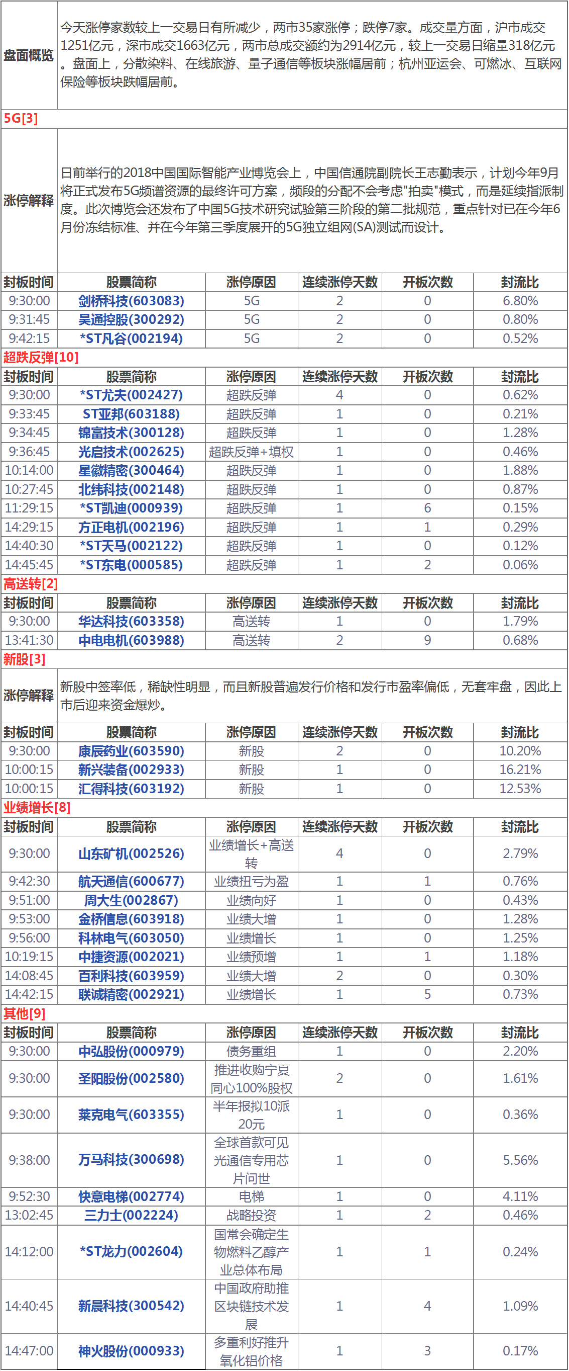今天漲停家數(shù)較上一交易日有所減少,兩市35家漲停;跌停7家。成交量方面,滬市成交1251億元,深市成交1663億元,兩市總成交額約為2914億元,較上一交易日縮量318億元。盤面上,分散染料、在線旅游、量子通信等板塊漲幅居前;杭州亞運(yùn)會(huì)、可燃冰、互聯(lián)網(wǎng)保險(xiǎn)等板塊跌幅居前。