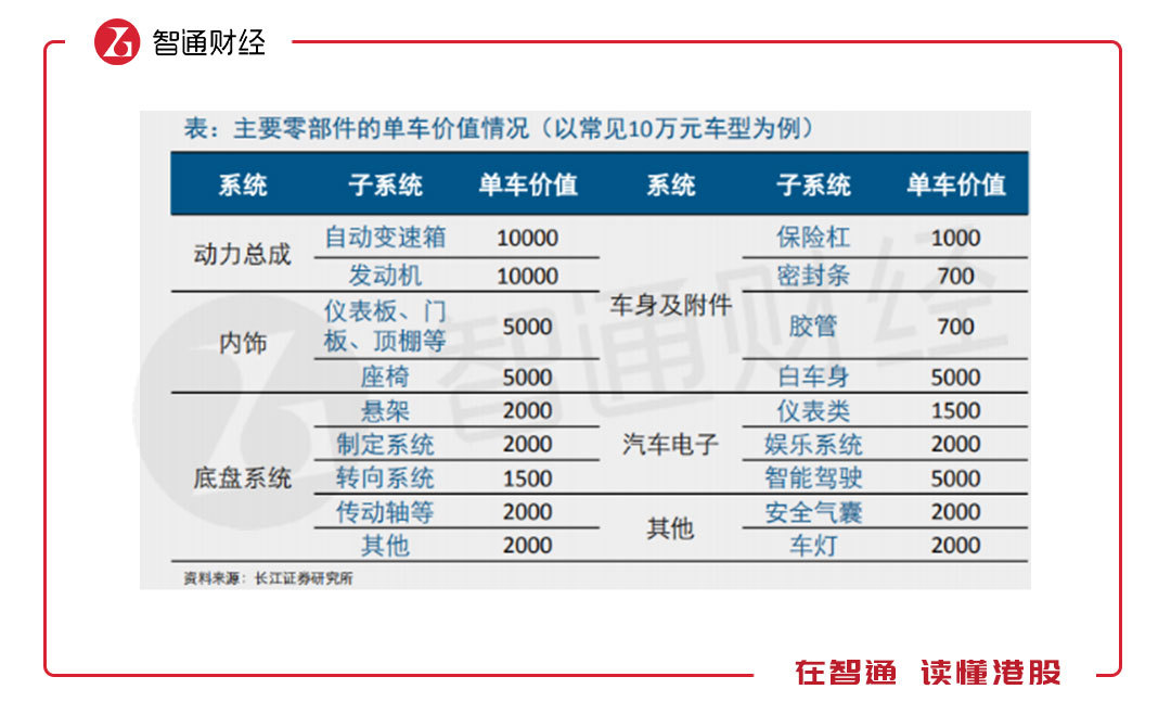 先看燃油車,按照長江證券的研究,以10萬元車型為例,各系統(tǒng)價值合計5.58萬元,動力總成占了35.8%,內飾及汽車電子占33%,底盤占17%,車身及附件占13.3%。