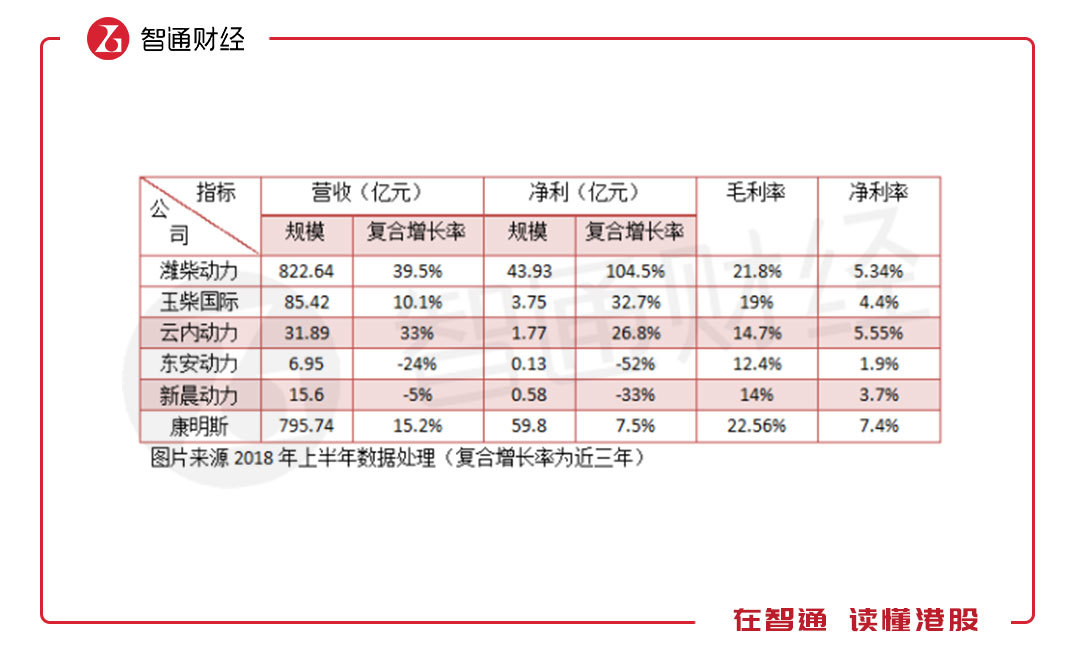 國內的發(fā)動機供應市場高度集中,前十大供應占據了超過7成的份額,主要為柴油機供應,適用于商用車,龍頭濰柴動力(02338)市場份額最大。汽油機適用于乘用車,由于主要為內供,市場數據較少。與國際龍頭康明斯相比,上半年國內的柴油機企業(yè)賺錢能力還是較低的。