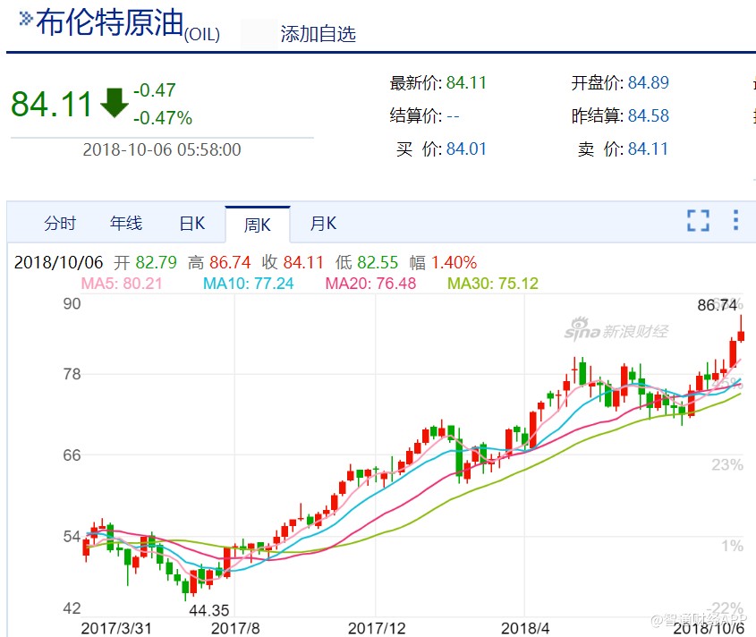 油價(jià)漲勢(shì)仍在持續(xù)。10月3日,布倫特原油盤中突破85美元/桶關(guān)口,創(chuàng)下近四年新高,這已是布倫特油價(jià)連續(xù)第5個(gè)季度上漲,是2007年初以來最長的一個(gè)上漲周期。