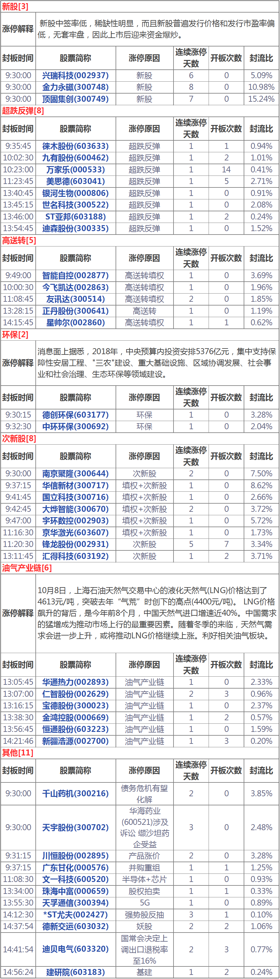 漲停分析:油氣概念強(qiáng)者恒強(qiáng)次新股多股漲停(10月10日)