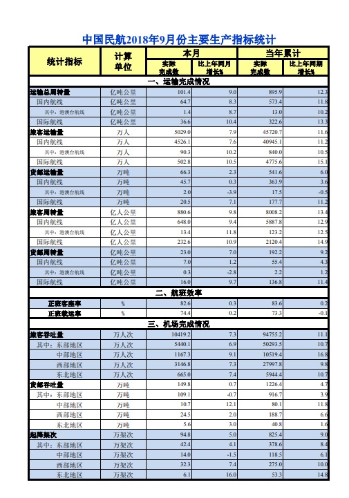 智通財(cái)經(jīng)APP獲悉,中國民用航空局今日發(fā)布的主要運(yùn)輸生產(chǎn)指標(biāo)統(tǒng)計(jì)顯示,今年9月,運(yùn)輸總周轉(zhuǎn)量達(dá)到101.4億噸公里,同比增長(zhǎng)9%;中國民航旅客運(yùn)輸量達(dá)到5029萬人,同比增長(zhǎng)7.9%,當(dāng)年累計(jì)運(yùn)輸量已達(dá)4.57億人;9月貨郵運(yùn)輸量為66.3萬噸,同比增長(zhǎng)2.3%。
