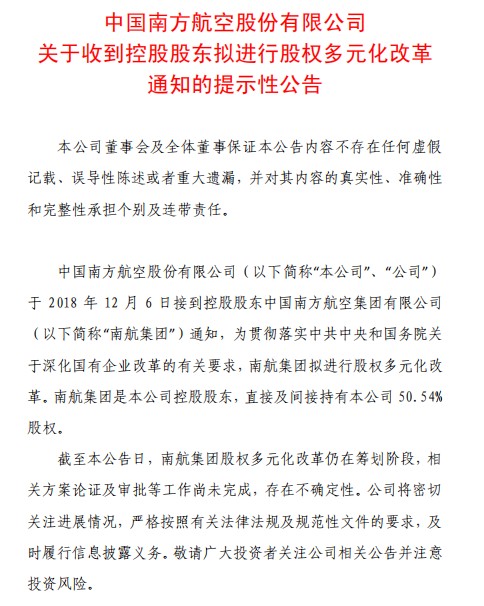 公告中稱,中國南方航空股份有限公司于2018年12月6日接到控股股東中國南方航空集團(tuán)有限公司通知,為貫徹落實(shí)中共中央和國務(wù)院關(guān)于深化國有企業(yè)改革的有關(guān)要求,南航集團(tuán)擬進(jìn)行股權(quán)多元化改革。南航集團(tuán)是本公司控股股東,直接及間接持有本公司50.54%股權(quán)。截至本公告日,南航集團(tuán)股權(quán)多元化改革仍在籌劃階段,相關(guān)方案論證及審批等工作尚未完成,存在不確定性。公司將密切關(guān)注進(jìn)展情況,嚴(yán)格按照有關(guān)法律法規(guī)及規(guī)范性文件的要求,及時(shí)履行信息披露義務(wù)。(文文)