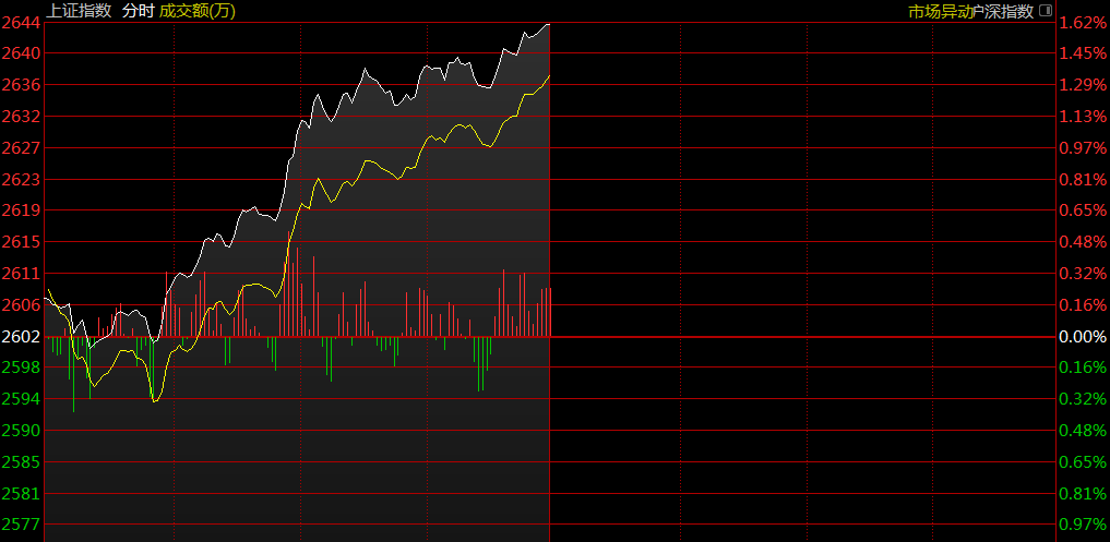 云財經(jīng)2018年12月13日訊 截至早盤收盤,上證指數(shù)報2643點,漲1.60%;深證成指報7844點,漲1.90%;創(chuàng)業(yè)板指數(shù)報1356點,漲1.35%。盤面上,板塊全面上漲,高鐵、水泥、家電、機場航運等板塊逆勢上漲。