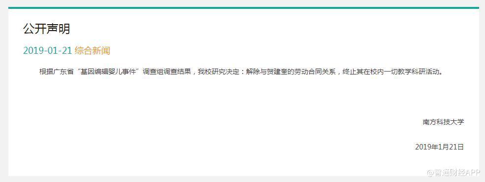 1月21日,南方科技大學(xué)發(fā)出公告稱,根據(jù)廣東省“基因編輯嬰兒事件”調(diào)查組調(diào)查結(jié)果,我校研究決定:解除與賀建奎的勞動(dòng)合同關(guān)系,終止其在校內(nèi)一切教學(xué)科研活動(dòng)。